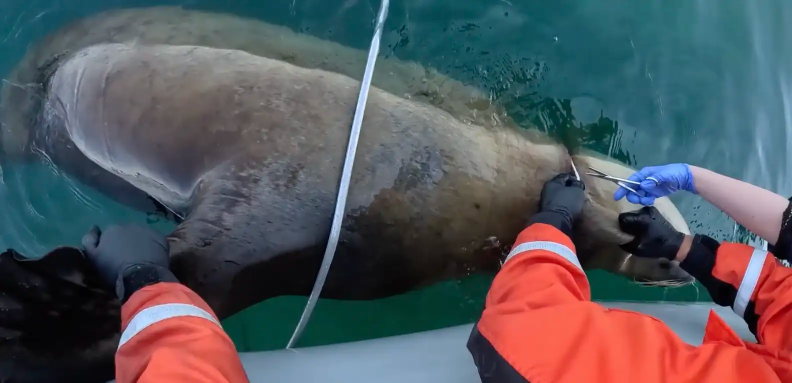 With her location confirmed, rescuers from SeaDoc Society, The Whale Museum, and veterinarians from Vancouver Aquarium mobilized to help. Working together, they carefully approached the injured sea lion and administered a light sedative — just enough to calm her but not to stop her from breathing or swimming.