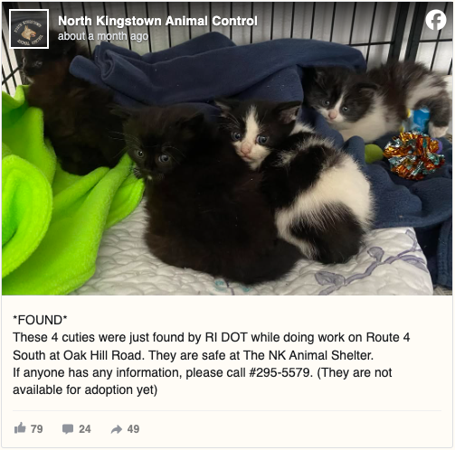 The four kittens were taken to the North Kingstown Animal Shelter, where they’re now safe, warm, and receiving all the care they need until they’re old enough to find forever homes.