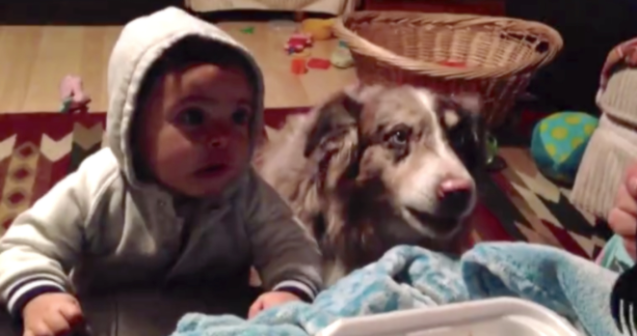 In the video here, Mom is trying to get the baby to say “Mama.” But the Australian Shepherd is smarter than people think! He’s seen this trick done once or twice, and he knows if you answer correctly, you get a treat.