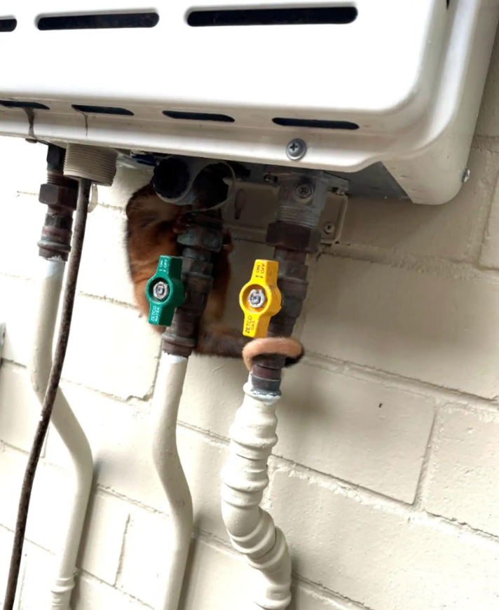 Erin guessed that the possum had bolted from his mother after being startled by the barking dog, finding the first hiding spot he could — the narrow space behind the water heater.