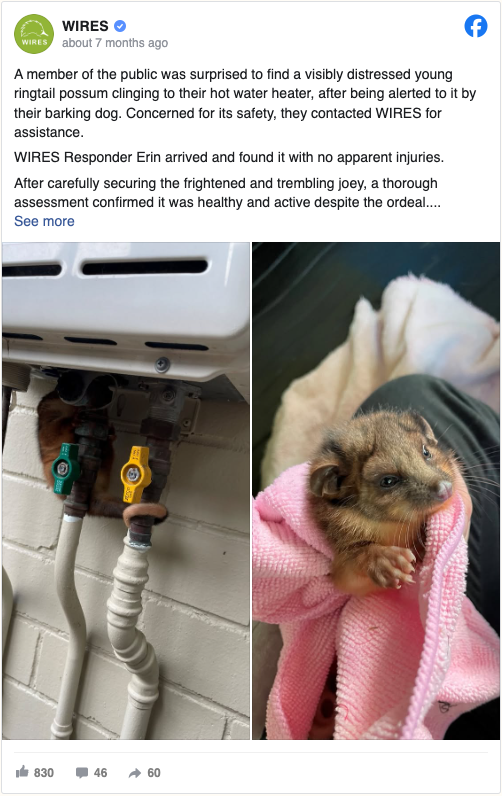 “[They were] surprised to find a visibly distressed young ringtail possum clinging to their hot water heater,” WIRES Wildlife Rescue wrote in a Facebook post.