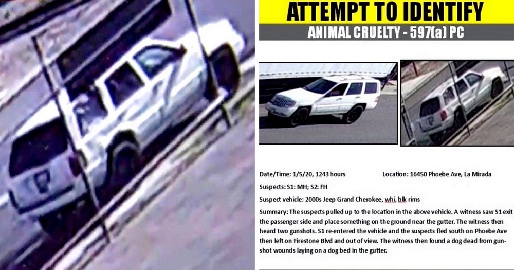 The footage shows 2 people driving a senior dog to an isolated industrial area in La Mirada and shooting him point blank twice.