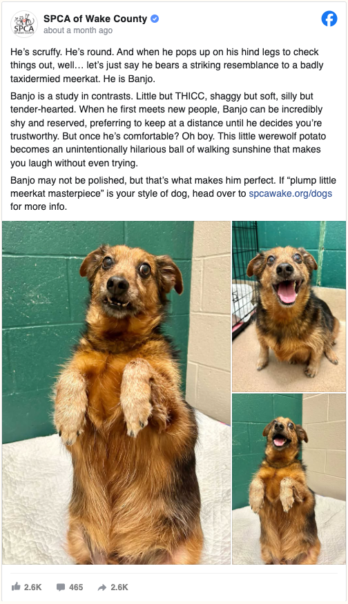 To help pets like Banjo get the care they need, you can donate to SPCA Wake County here.