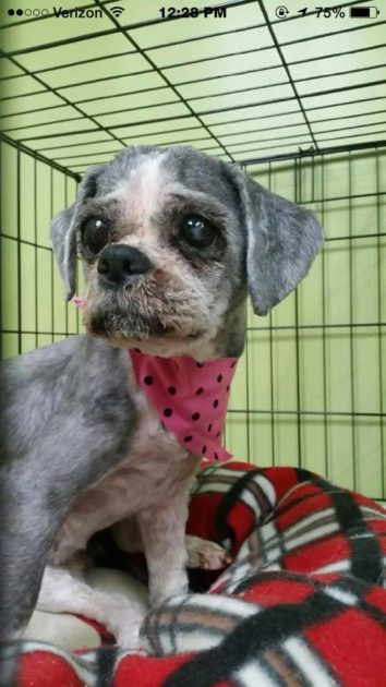 The dog was abandoned outside of Jasper County Animal Rescue in a small carrier. She was covered in fleas, and cockroaches were using her fur as their nests.