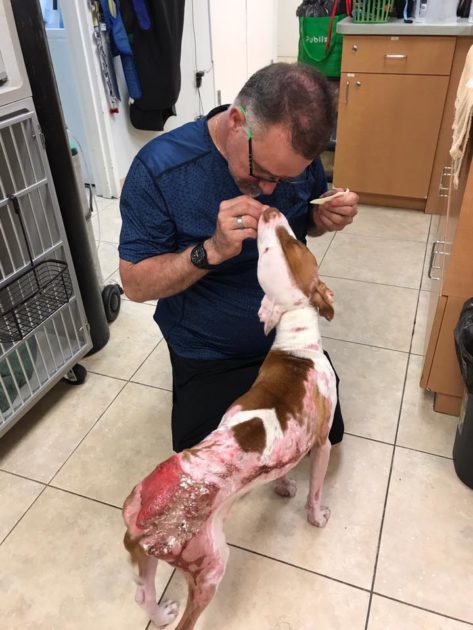 Firefighter Marcos Orozca cut the two-year-old dog free and rushed over to Peggy Adams Animal Rescue for help. After being looked at by the medical team, the dog was transferred to Jupiter Pet Emergency & Specialty Center (JPESC) to receive specialized care for his burns.
