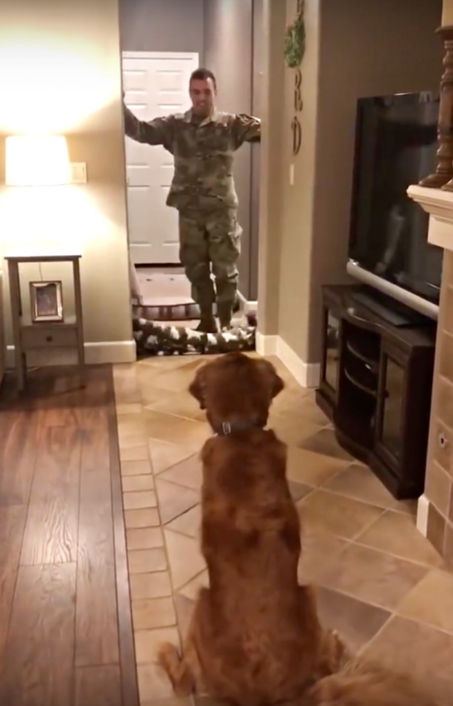 He sees his dad after being deployed for 9 months!!! His reaction is the sweetest, most heartwarming thing I’ve seen in a long time! The dog’s whole body wiggles, he whimpers, he says in dog: “Dad, I’ve missed you so darn much! I’m so happy you’re home!”
