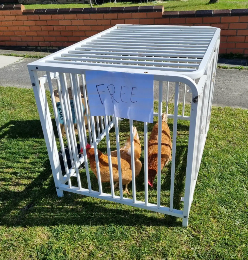 Sitting quietly on the curb were two brown hens, confined to a small cage. A handwritten sign taped to the front read just one word: “Free.”