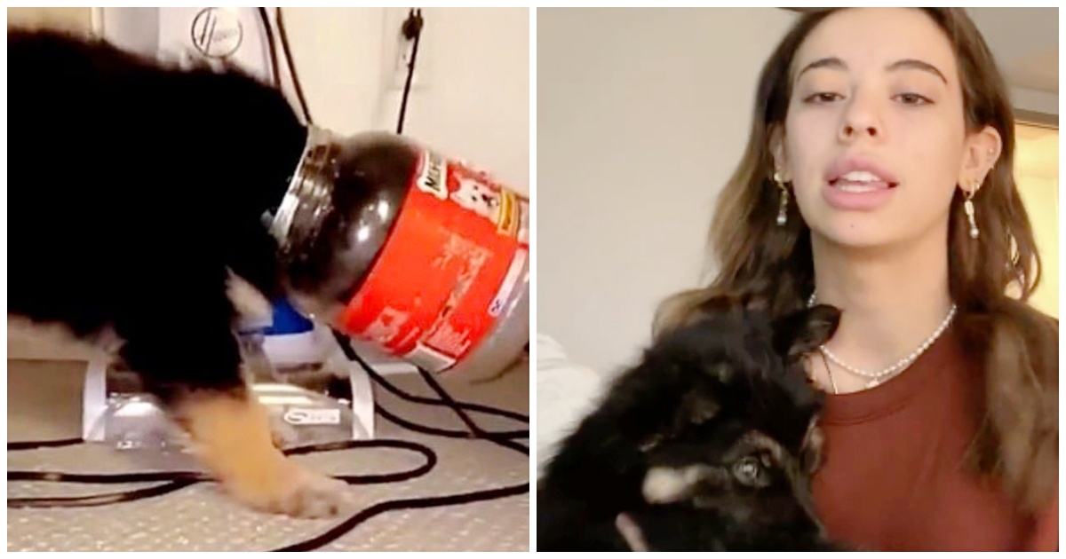 Lauren Kettering’s dog, Rocky, is seen with his head stuck in a treat jar in the video. The poor dog struggles to get it off, but Lauren cackles and laughs in the background.