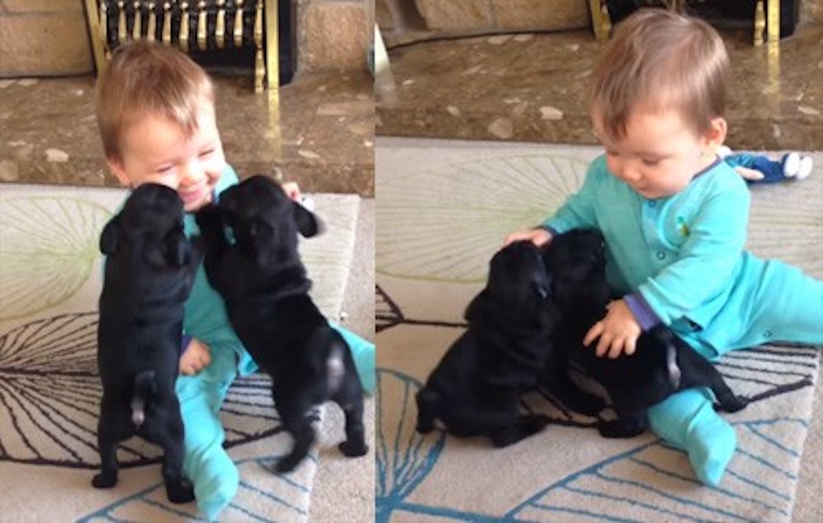 It's just a simple video of an adorable baby boy playing, cuddling, giggling with his pals, two adorable Pug puppies!