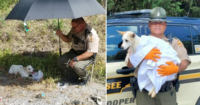 That was the case recently after one trooper stopped to help a stray dog suffering in the scorching sun — and later gave the animal a home.