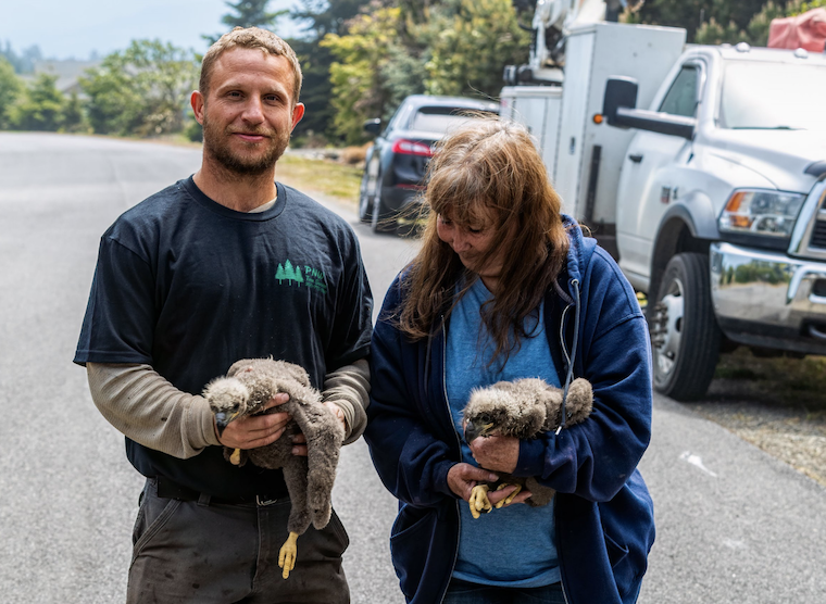 “Ricky & Lucy have their babies back! A huge thank you to Pacific Northwest Tree Service owner Casey Balch, and his guy Travis Waddell, and Sara Penhallegon from Center Valley Animal Rescue, and Jaye Moore, retired from the NW Raptor & Wildlife Center here in Sequim,” Ross wrote on Facebook.