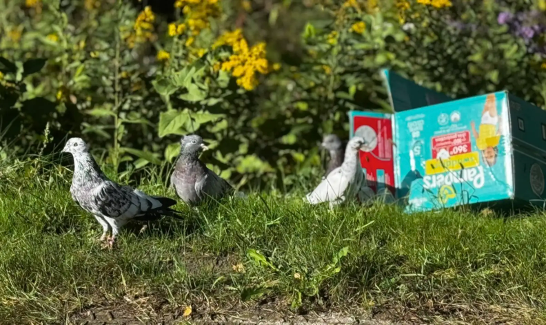 A large diaper box sat overturned on the side of the road — and next to it, a cluster of white and gray pigeons huddled together in confusion.