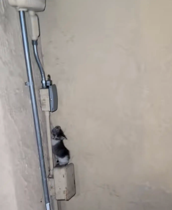 Following the sound, Siena discovered a tiny kitten standing alone on top of an electrical box, drenched and trembling.