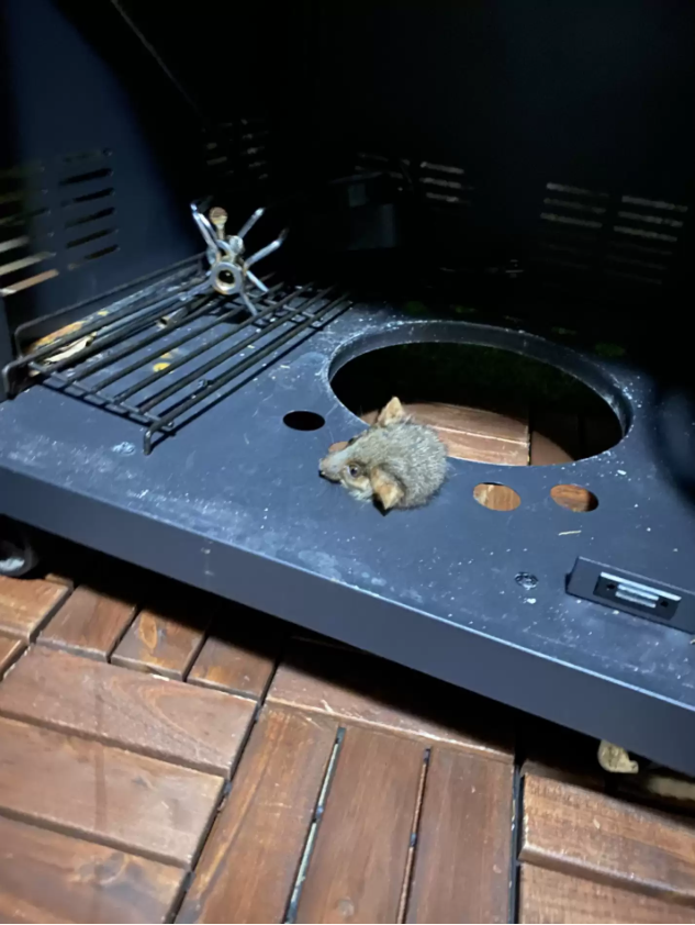 The tiny possum had somehow squeezed his head through one of the metal holes in the barbecue — and was now completely trapped.