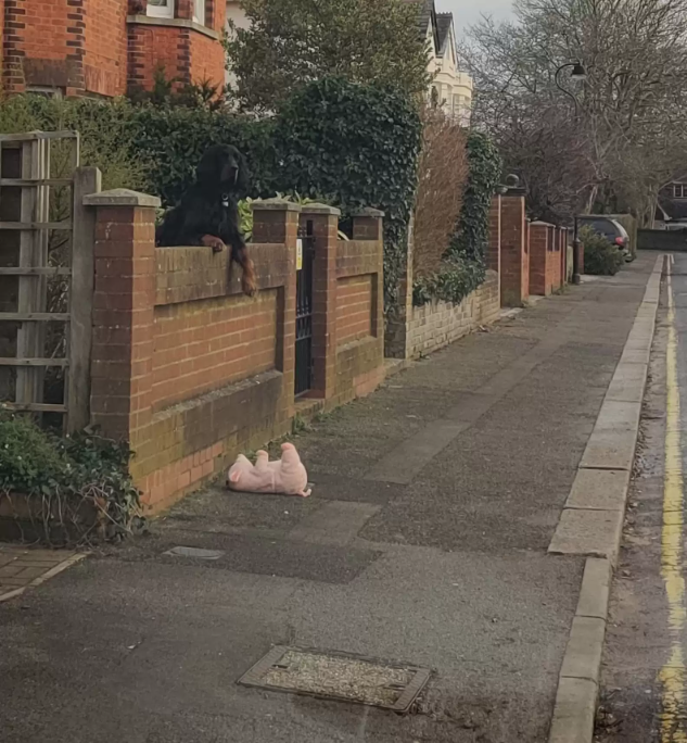 The poor pup had accidentally dropped his beloved stuffed pig over the wall and was waiting patiently, hoping someone kind might come along to help.