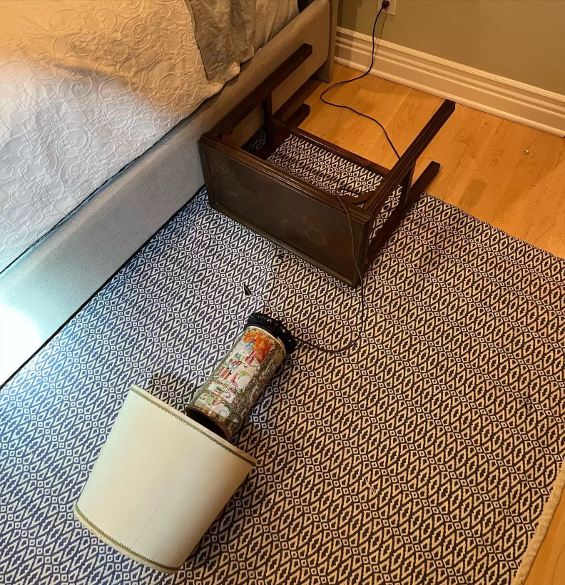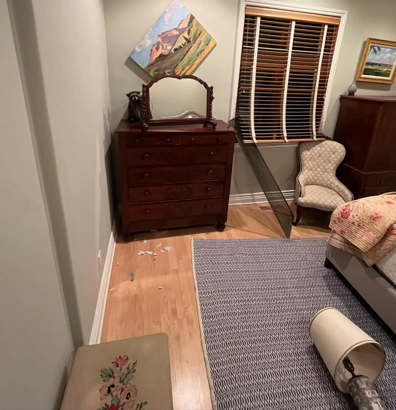 When she turned on the lights, the scene looked like a break-in. Chairs were toppled, potted plants smashed, even paintings knocked from the walls. Her home had been ransacked.