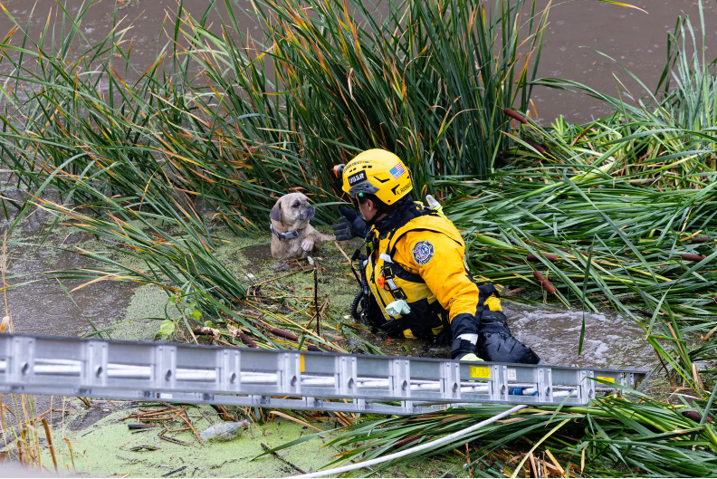 Using a ladder, ropes, and their swift-water rescue team, firefighters carefully made their way into the canal. Moments later, the pup was safe — shivering but alive — in the arms of her rescuer.